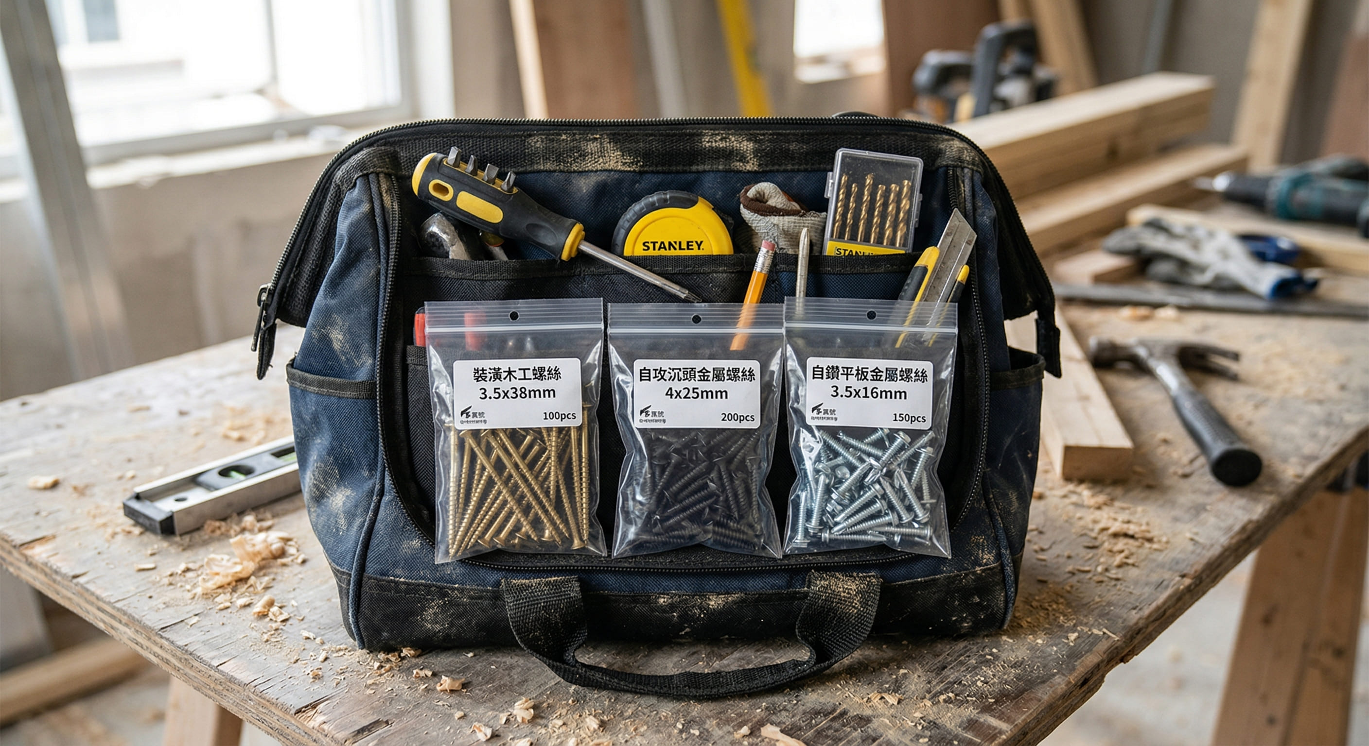 針對室內設計、木作裝潢與機電拉線等不同工種,我們推出了專屬的裝潢工程螺絲小包裝。無論是木攻牙、鑽尾螺絲還是輕鋼架專用五金,經過精算的分裝重量,讓師傅能把一整天的用料輕鬆放進工作袋或工具包,隨取隨用,來回搬運的折返跑大幅減少。
