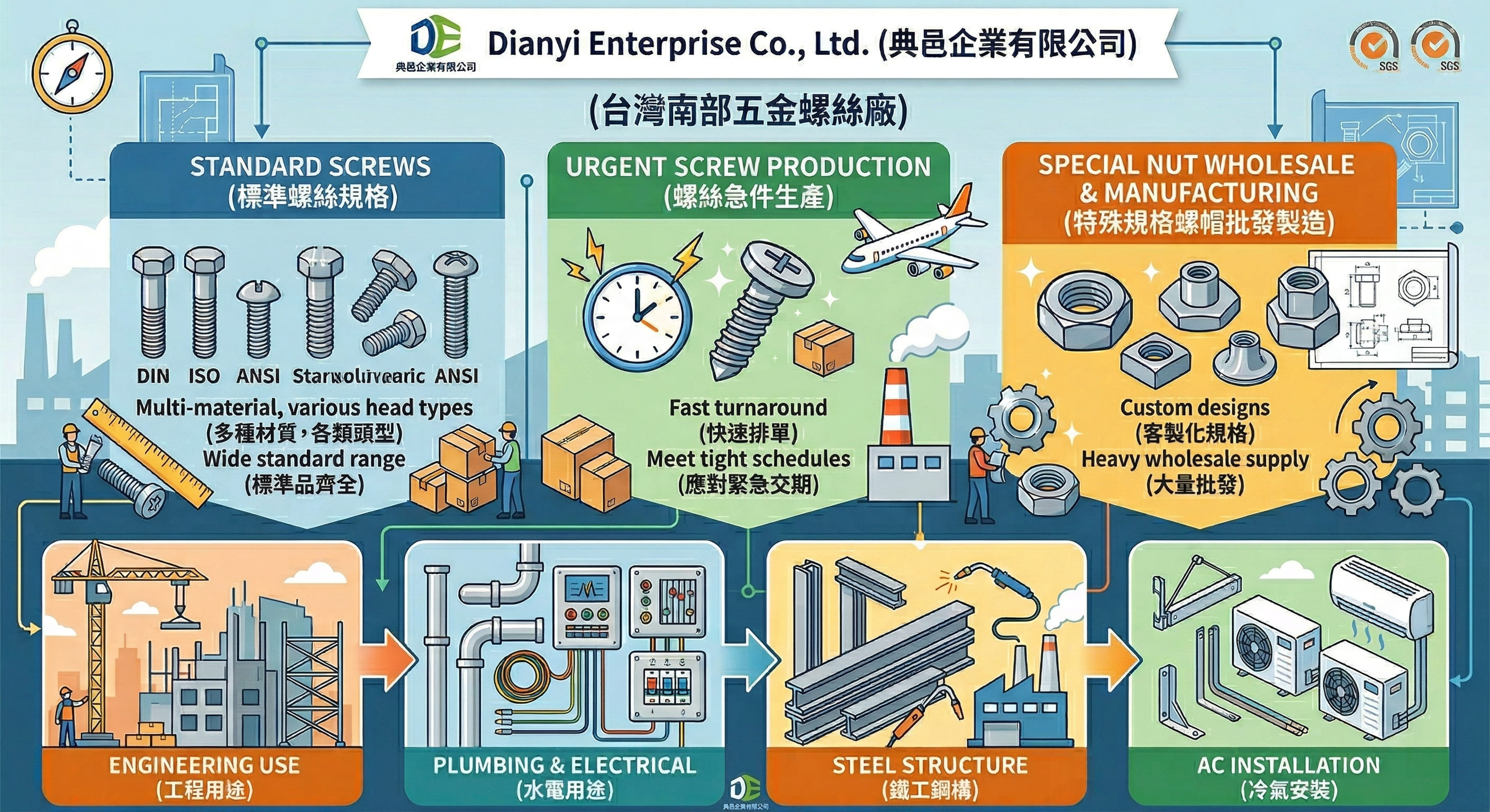 市場瞬息萬變,企業的採購需求也日益多元。作為深耕在地、量能充沛的南部五金螺絲廠,我們打破傳統大盤商僵化的銷售模式,以「彈性」與「即時」構築出全方位的五金供應網絡: